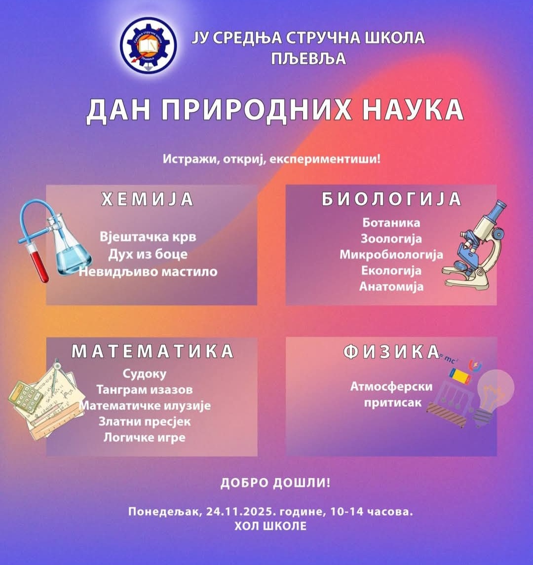 ЈУ Средња стручна школа Пљевља позива ученике свих основних школа у Пљевљима, гимназијалце, наставнике, директоре школа, али и све заинтересоване грађане, да у великом школском холу 24. новембра 2025. године присуствују обиљежавању Дана природних наука, који се организује у сусрет прослави Дана школе.
