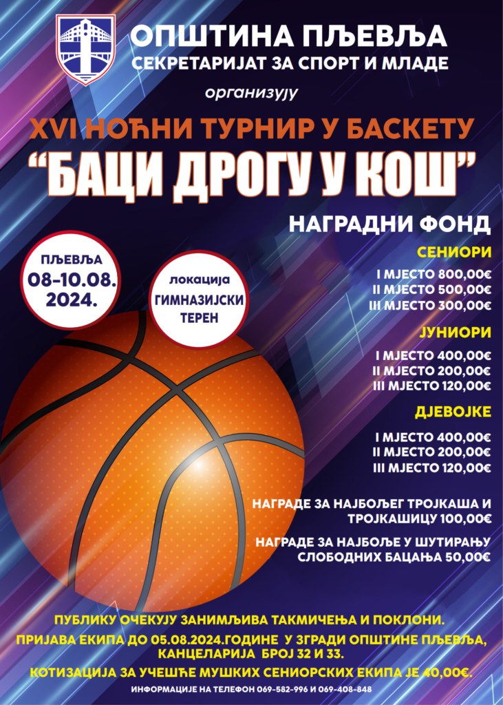 Секретаријат за спорт и младе Општине Пљевља и ове године организује традиционални Турнир у баскету под називом „Баци дрогу у кош“ који ће се одржати у периоду од 8. до 10. августа 2024. године.