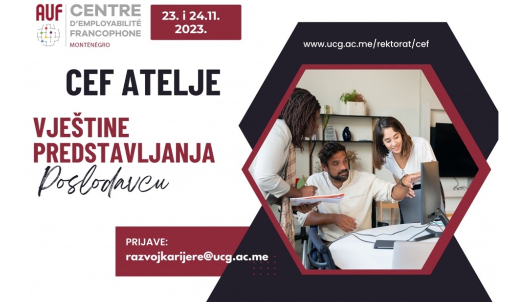 U organizaciji Frankofone kancelarije za zapošljavanje i Kancelarije za razvoj karijere i cjeloživotno učenje Univerziteta Crne Gore održaće se dvodnevna radionica pod nazivom “CEF atelje – Vještine predstavljanja poslodavcu”, namijenjena studentima svih godina studija.