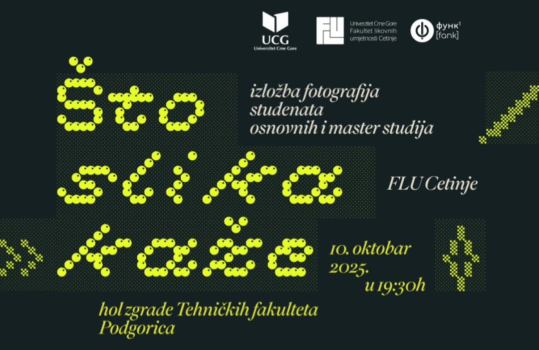 Izložba fotografija studenata Fakulteta likovnih umjetnosti Cetinje Gore pod nazivom „Što slika kaže“ biće otvorena 10. oktobra u 19.30 sati u holu tehničkih fakulteta, u okviru programa Festivala umjetnosti nauke i kulture, koji realizuje Univerzitet Crne Gore.