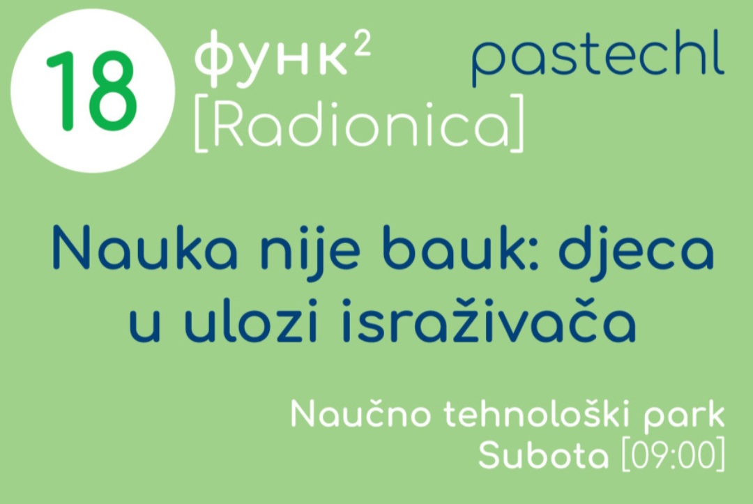U okviru Festivala umjetnosti, nauke i kulture – FUNK 2025, u programskoj cjelini FUNK Radionice, biće održana radionica pod nazivom „Nauka nije bauk: Djeca u ulozi istraživača“, 18. oktobra u 9.00 časova, u Naučno-tehnološkom parku Crne Gore, a kao segment međunarodne konferencije PASTECHL Podgorica 2025.