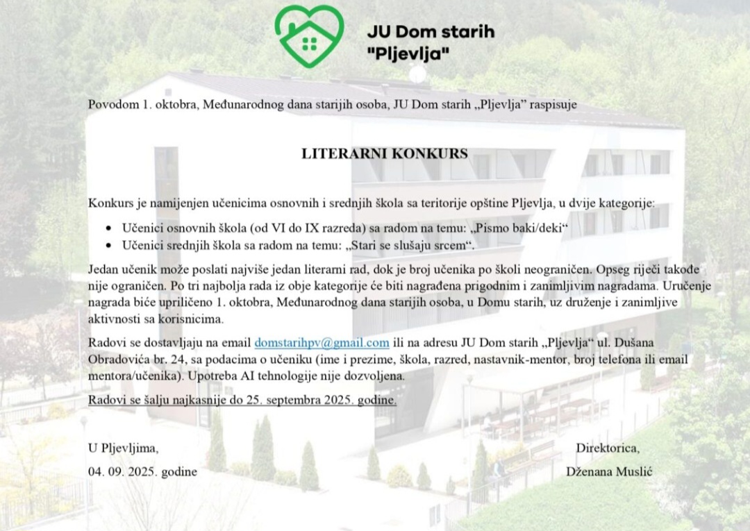 JU Dom starih „Pljevlja“ raspisao je literarni konkurs povodom 1. oktobra, Međunarodnog dana starijih osoba. Konkurs je namijenjen učenicima osnovnih i srednjih škola sa teritorije opštine Pljevlja, a radovi se primaju u dvije kategorije: