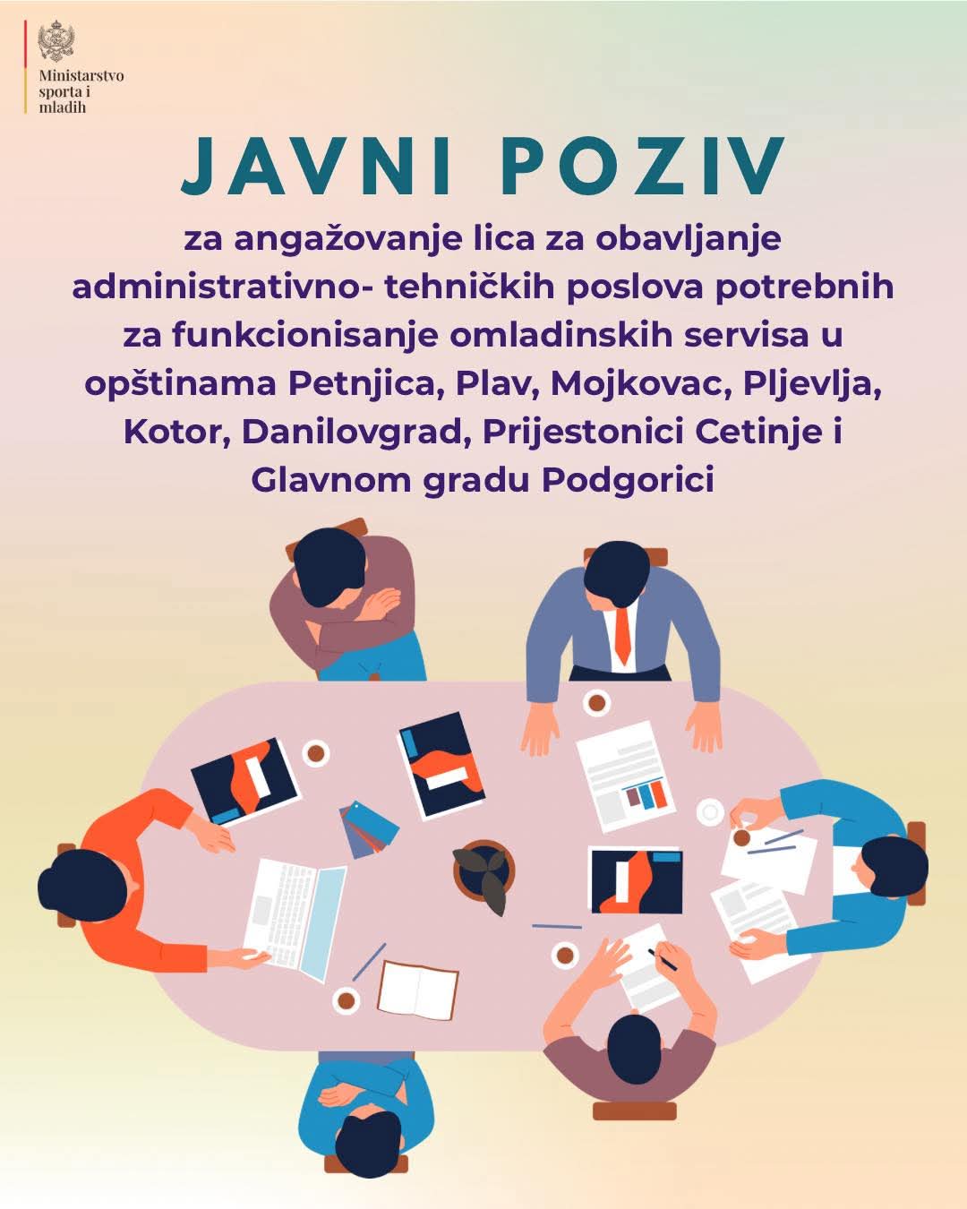 📢 Ministarstvo sporta i mladih raspisuje Javni poziv za angažovanje lica za obavljanje administrativno- tehničkih poslova potrebnih za redovno funkcionisanje omladinskih servisa u opštinama Petnjica, Plav, Mojkovac, Pljevlja, Kotor, Danilovgrad, Prijestonici Cetinje i Glavnom gradu Podgorici