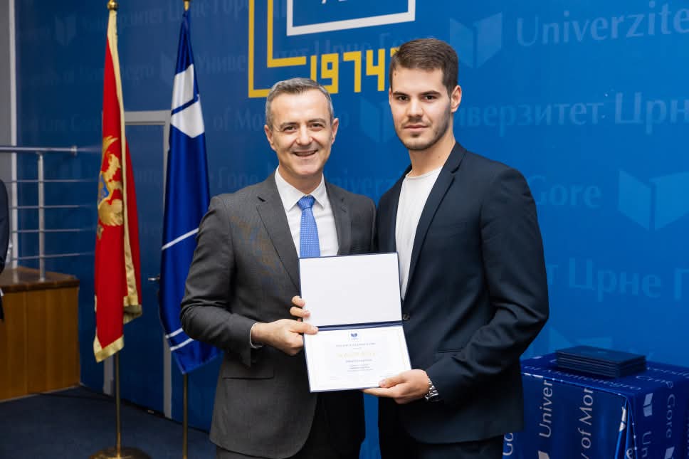 🧑🏽⚖️⚖️ Nikola Kovačević, student treće godine osnovnih studija na Pravni fakultet Univerzitet Crne Gore, proglašen je najboljim studentom i dobitnikom nagrade za studijsku 2025/26. godinu sa prosjekom 9.88. Nagradu mu je uručio rektor UCG, prof. dr Vladimir Božović, na svečanosti održanoj na Univerzitetu.