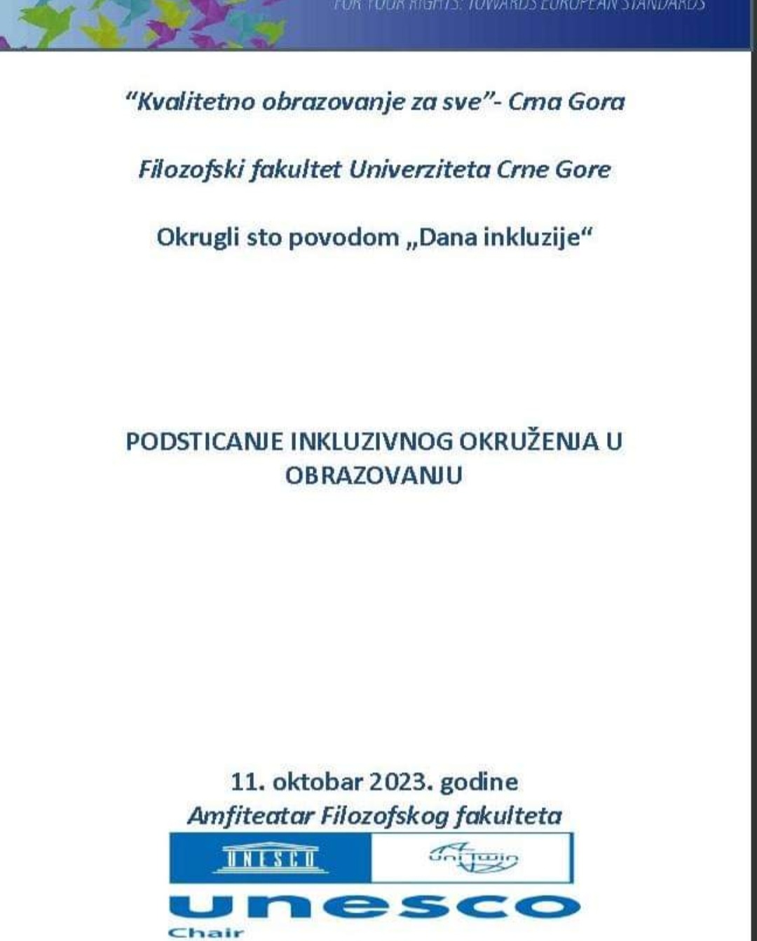 Povodom Dana inkluzije, 11. oktobra 2023. godine sa početkom u 10.30h na Filozofskom fakultetu biće organizovan okrugli sto na temu Podsticanje inkluzivnog okruženja u obrazovanju.