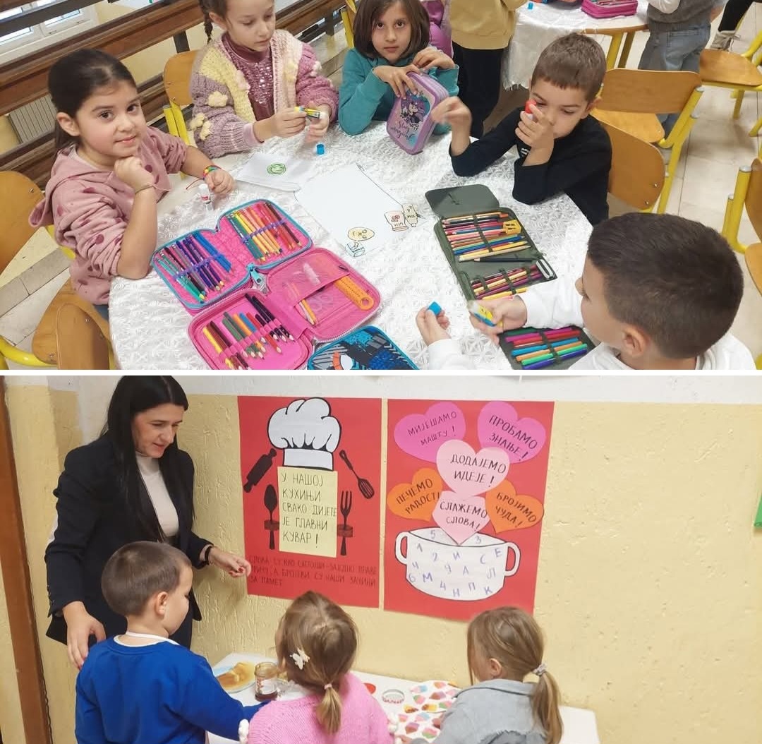 Učiteljice Osnovne škole “Jagoš Kontić”, Rajka Antović, Vera Milović i Ljiljana Jašović, vaspitačice Ivana Ždralević i Milica Jelić, asistentkinje u nastavi Ljiljana Korać i Jelena Ðurđevac su sa učenicima prvog razreda realizovale ogledni čas iz CSBH jezika i književnosti na temu “Majstori za palačinke”.