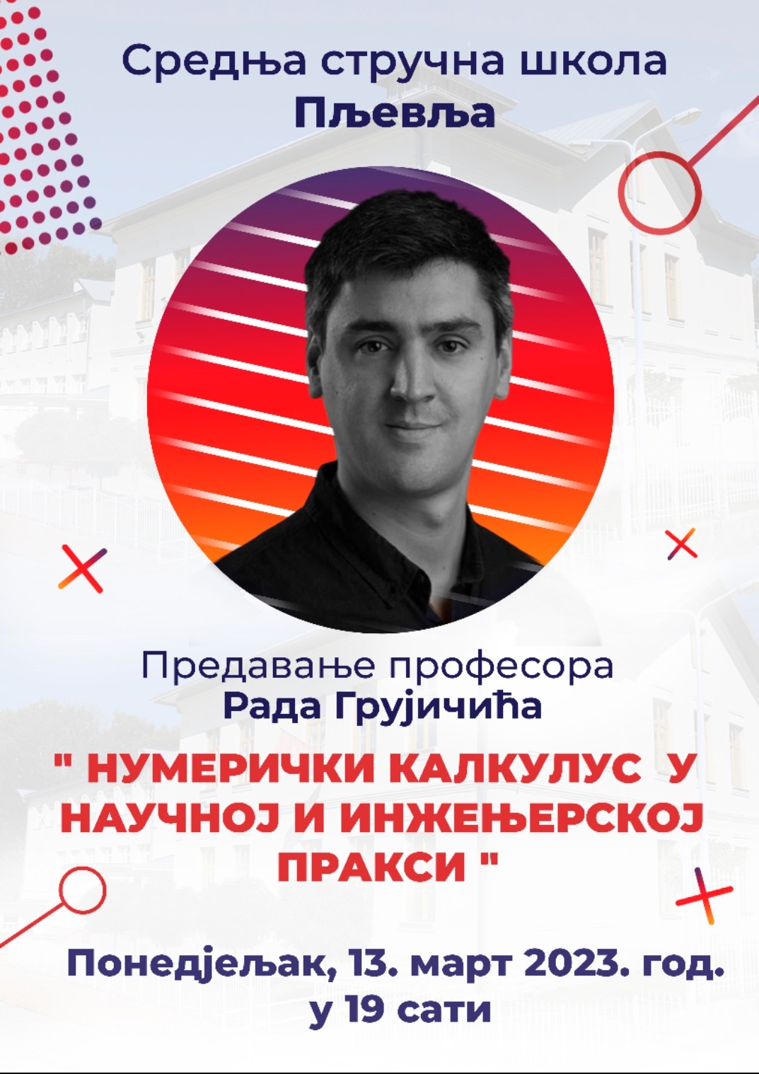 Srednja stručna škola Pljevlja u ponedjeljak 13. marta u Svečanoj sali ove škole, u 19 časova, organizuje predavanje profesora Rada Grujičića na temu „Numerički kalkulus u naučnoj i inženerskoj praksi“.