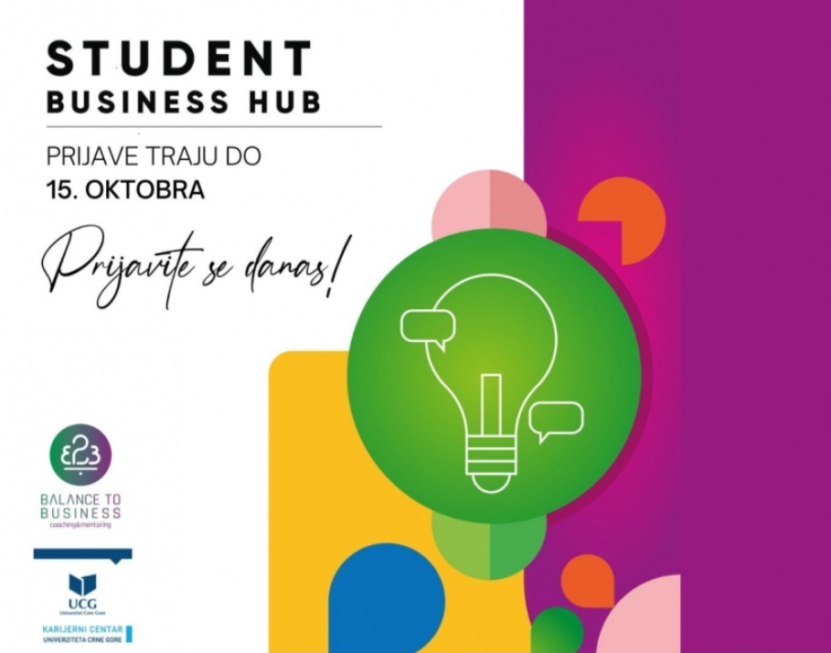 Kancelarija za razvoj karijere i cjeloživotno učenje Univerziteta Crne Gore u saradnji sa kompanijom Balance to Business organizuje šesti Student Business Hub, besplatan edukativni program namijenjen studentima završnih godina Univerziteta Crne Gore (treća godine osnovnih studija, specijalističkih, jednogodišnjih ili dvogodišnjih master studija).