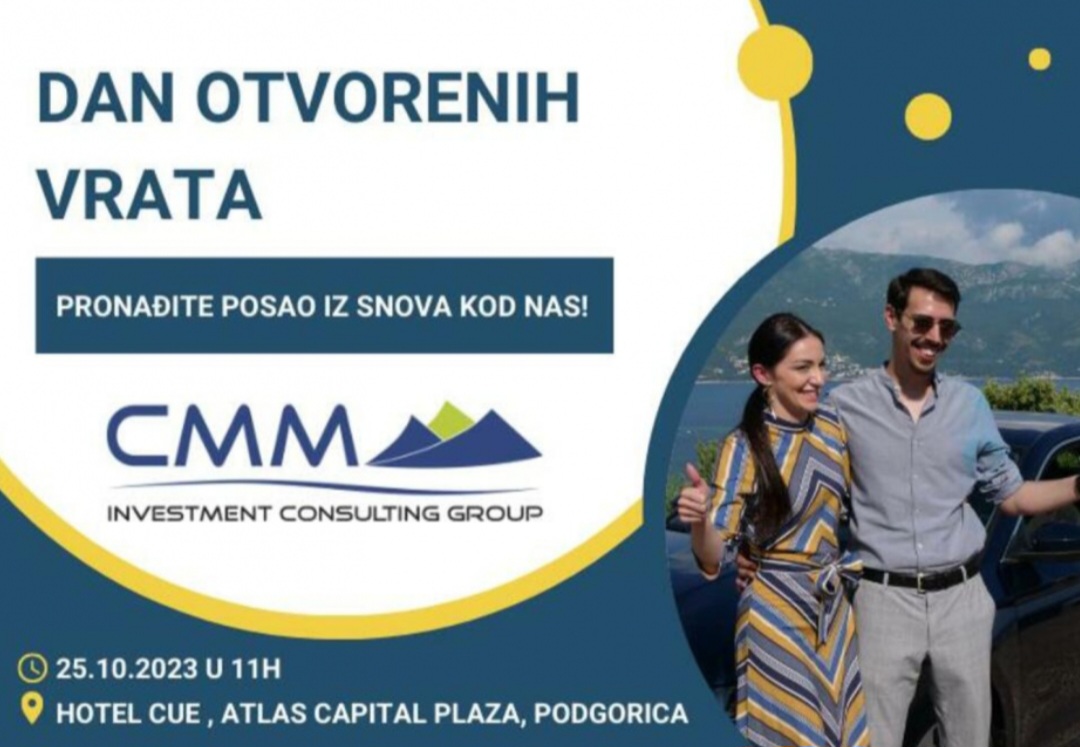 CMM Investment Consulting Group sa velikim zadovoljstvom poziva sve zainteresovane studente da prisustvuju Danu otvorenih vrata, koji će se održati u srijedu, 25. oktobra 2023. godine u hotelu Cue, Atlas Capital Plaza u Podgorici, sa početkom u 11 časova.
