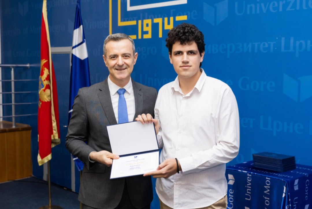 Pavle Bojović, student Mašinskog fakulteta, ne pristaje na prosječnost. Njegov akademski put obilježen je visokim standardima, predanošću i jasnom odlukom da uvijek ide korak dalje — i upravo mu je takav odnos prema učenju donio prosjek 10 i nagradu Univerziteta Crne Gore za postignuti uspjeh u 2025/26. godini. Nagradu mu je uručio rektor Univerziteta Crne Gore, prof. dr Vladimir Božović, na svečanosti u Rektoratu UCG.