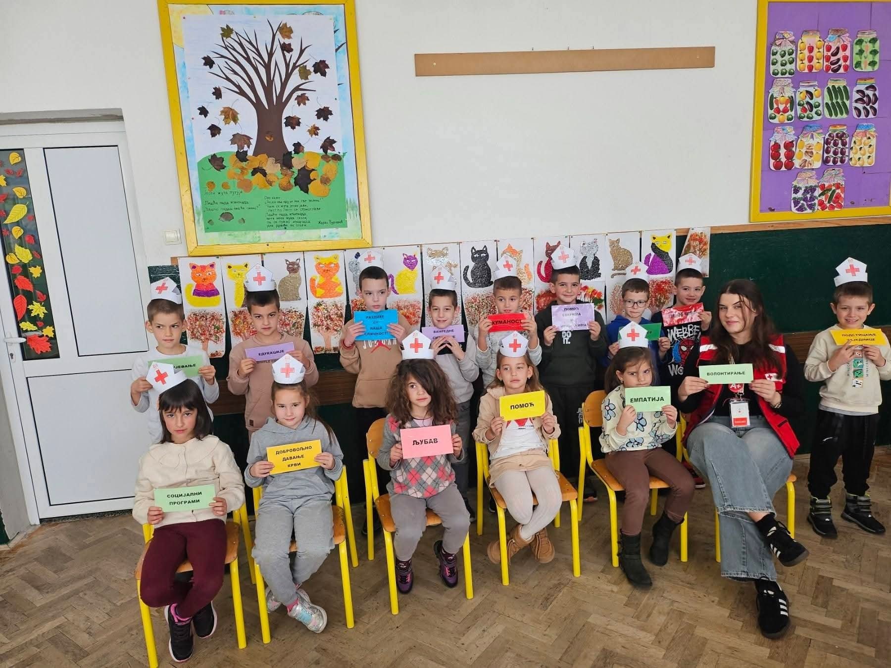 Gost iznenađenja bila je volonterka Crvenog krsta Nikolina Đikanović, inače, bivša učenica ove škole, koja je približila pojam volontiranja i razne vidove pomoći drugima. Nakon prergšt pitanja i potvrde o potrebi humanosti, solidarnosti, empatije i saradnje, učenici su izrađivali volonterske kape i pano.