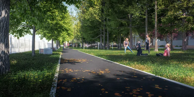Sve površine biće popločane behaton pločama i tartan podlogom, uz ugradnju ivičnjaka i uređene prelaze.