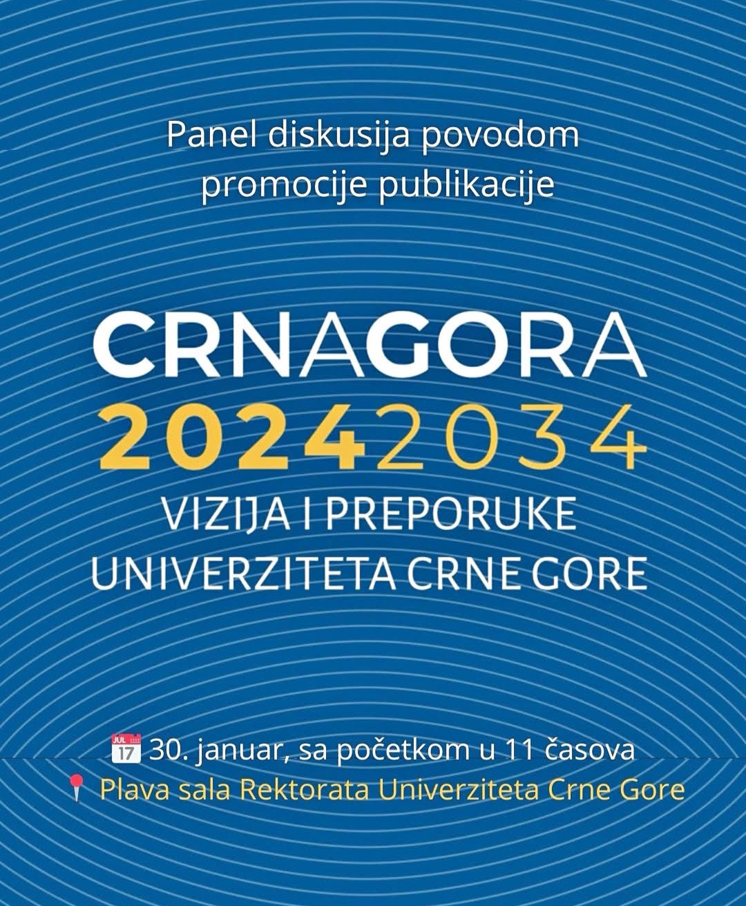 🎓📘 Univerzitet Crne Gore organizuje panel diskusiju povodom promocije publikacije „Crna Gora 2024–2034: Vizija i preporuke Univerziteta Crne Gore“, koja predstavlja strateški dokument sa smjernicama i preporukama za dugoročni razvoj Crne Gore. Panel diskusija biće održana u petak, 30. januara 2026. godine, sa početkom u 11 časova, u Plavoj sali Rektorata Univerziteta Crne Gore.