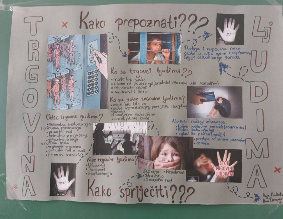Zidne novine (pano) pod nazivom „Kako prepoznati trgovinu ljudima“ uradile su učenice drugog razreda Ana Despotović i Anja Anđelić.
